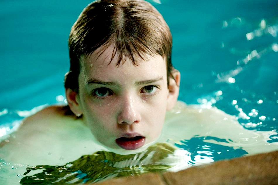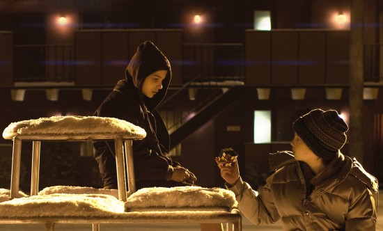 Even past the story, the film’s aren’t terribly divergent. At least not enough to bother with here. Let the Right One In is a beautifully constructed and original film with great performances and the timeless quality so many directors hope for. But this is not a comparison of an original film and it’s remake; this is an analysis of Matthew Reeves’ American made Let Me In, and I will subsequently do my best to keep it that way. Starting with the performances of his two child actors, both of whom had made names for themselves prior to this film. Kodi Smit-McPhee broke out with 2009’s The Road, and Chloe Moretz was huge on the screen with this past summer’s Kick-Ass. While I didn’t see The Road, I was supremely impressed with Kick-Ass‘ Hit-Girl and excited to see a subdued Moretz in a much darker role. In the end though it was Smit-McPhee’s Owen who really shined through. Owen’s life is a miserable winter of neglect and ruthless persecution and Smit-McPhee is beautifully tragic in the role. Certainly he has the look of a child perpetually tormented by all manner of things, but his performance reinforces so strongly his misery. Meanwhile the school bully’s obsession with Owen is as dark as any antagonist’s and it is a sheer impossibility not to empathize. It’s this empathy that drives Let Me In and underlies its starkest moments. Once the subtextual connection between Abby’s degraded guardian and Owen has been fully entrenched, we see Owen’s future not as a possible escape, but as a further, if slightly less lonesome detention. Owen is plainly not a happy character.