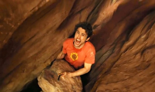 doesn’t feel comfortable without enumerable cuts, transitions and split screens. This is an impressive and occasionally interesting approach, but you can’t watch it without wondering what the point is. But more on that later. Ralston treks his way through picturesque Utah canyon country, and spends an hour or two frolicking in an underground pool with two young hikers, Kristi (Kate Mara) and Megan (Amber Tamblyn). This is a nice enough sequence, providing a small glimpse at Ralston’s outgoing kookiness. He parts ways with the ladies, begins his descent into Blue John’s canyon and it’s here that an errant boulder captures Aron, pinning him down far from any other hikers. As the reality of his situation sets in, the film’s title finally materializes.