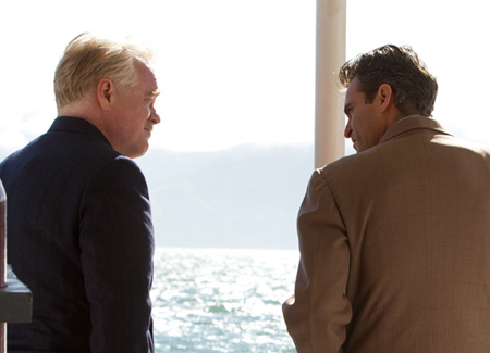 Freddie Quell (Joaquin Phoenix) is a creature somewhere on the spectrum between animal and man. He walks like a man, and talks like one, but he seems incapable of self-control, or even self-awareness. He wanders from place to place, job to job, regularly supplying his brain with cocktails of alcohol and household chemicals. To forget perhaps, or simply to get stoned. It’s not clear, to him or us. And then one day his path crosses with Lancaster Dodd (Philip Seymour Hoffman), a man so self-aggrandizing it’s hard not to take him seriously. Dodd is The Master of The Cause, a kind of faith-based science that can build a bridge through time and cure cancer. And born of this meeting is a stubborn link between two men who share no real connection save their violent infatuation with one another. Dodd makes Freddie his project, and Freddie makes Dodd his sage.