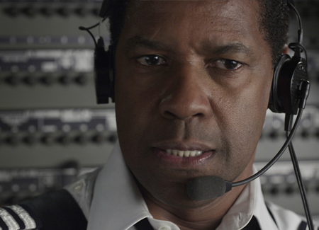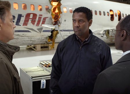 Whitaker (Denzel Washington), is an alcoholic and a drug addict. Flight’s opening scene finds him in a wrecked hotel room, battered by the previous night’s excess, snorting lines to bring himself back through the fog. He drinks before and during the titular flight, and after the crash has his blood drawn by the accident-investigating NTSB. This positive test for alcohol and cocaine leads Whip on a name-clearing journey for the truth behind the crash. After years of hiding his noxious habits, he must now find his way around them, all the while ignoring the appeals to tone it down from Charlie (Bruce Greenwood), his longtime friend and head of the Pilots Union; pleading with a virtuous flight attendant (Tamara Tunie) and bible-thumping co-pilot (Brian Geraghty) to lie for him; avoiding even the calls to action from his product-of-circumstance companion Nic (Kelly Reilly), herself an addict. Whip, like many alcoholics, is ultimately concerned only with what this conflict will do for his habit, and so, he begins his descent.